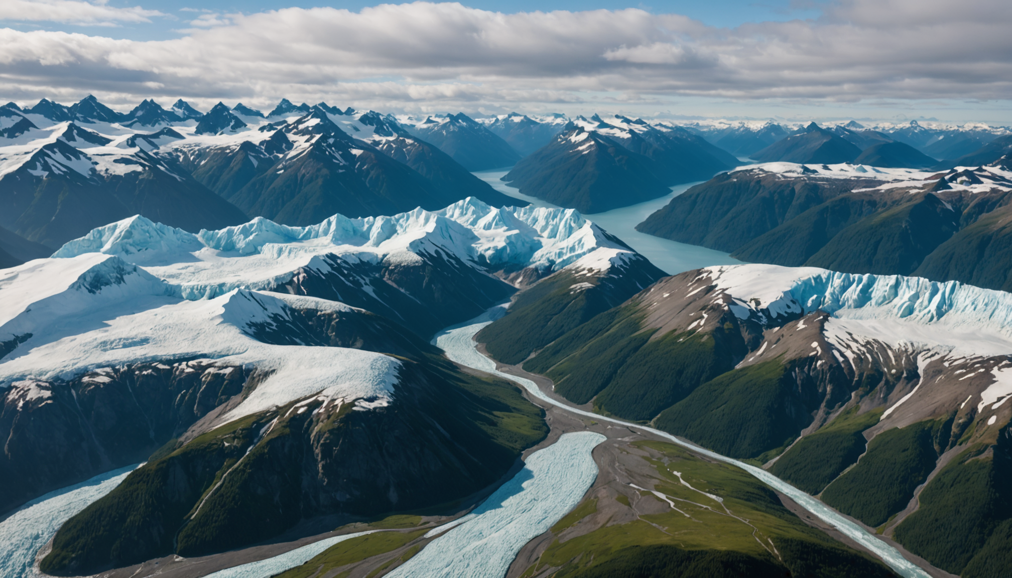 An aerial view of Prince William Sound with glaciers and mountains